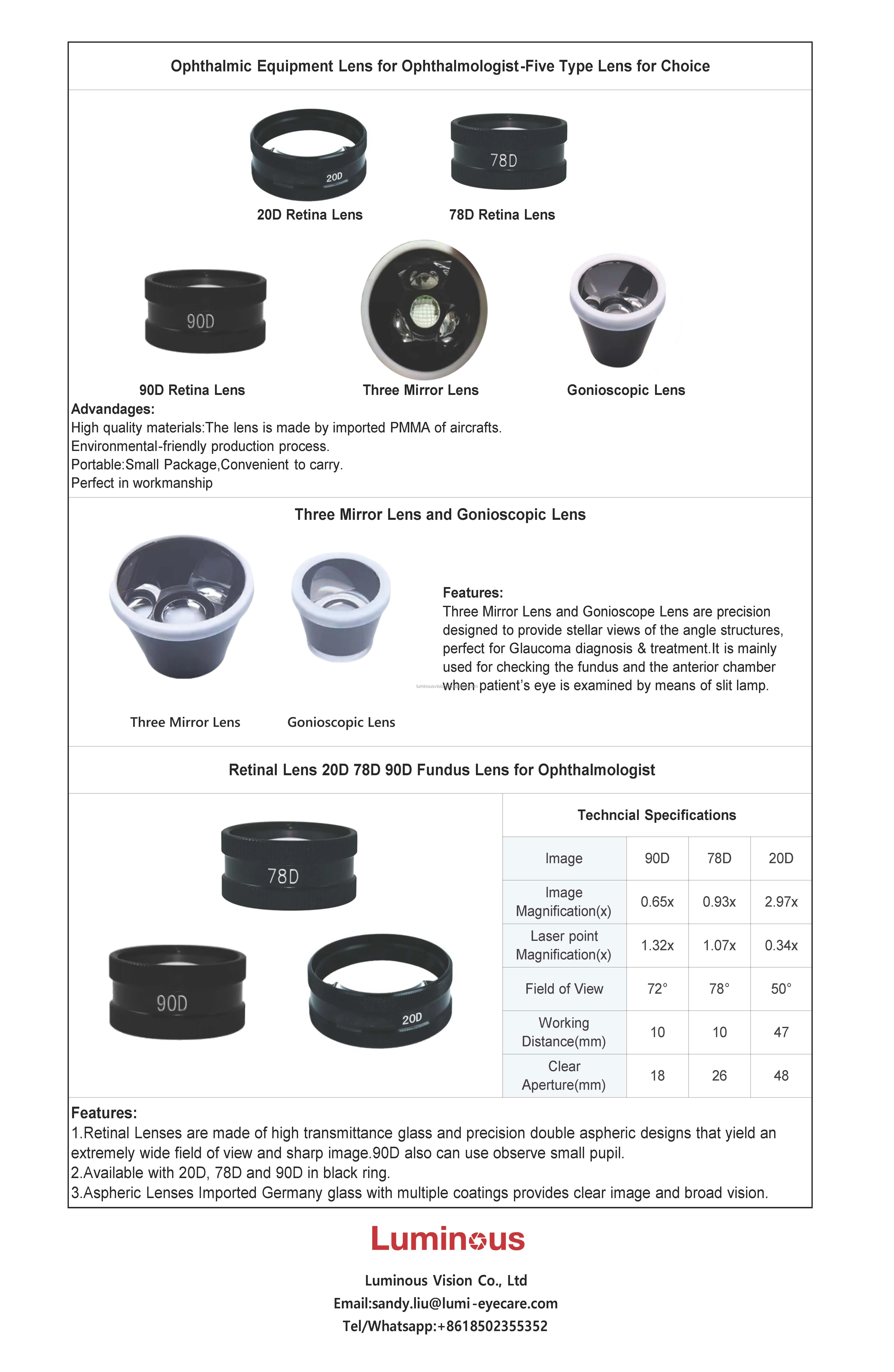 1.Retinal Lenses are made of high transmittance glass and precision double aspheric designs that yield an extremely wide field of view and sharp image.90D also can use observe small pupil.